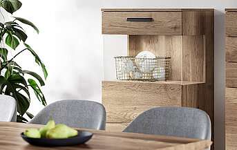 L’interaction naturelle entre le blanc mat de notre fameuse façade anti-traces de doigts EASYTOUCH et la finition chêne authentique est ouverte et harmonieuse. Les éléments variables comme la table basse, les vitrines et les crédences assorties forment ainsi un ensemble parfait pour les amateurs d’originalité.
