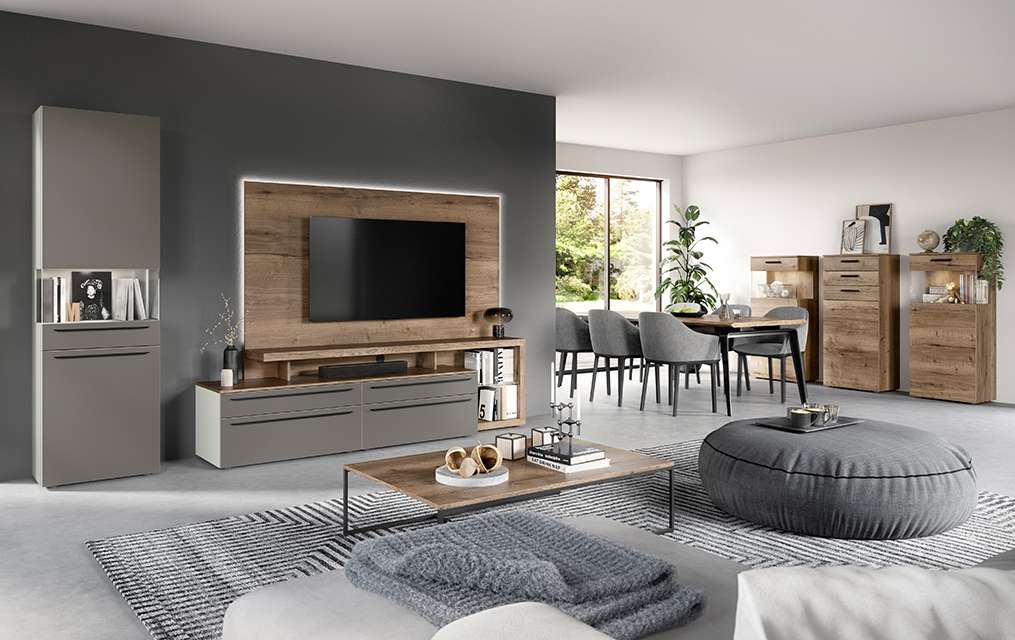 Notre nouveau gris taupe est confortable et offre de très nombreuses possibilités de combinaison. Découvrez votre accroche-regard personnel, par exemple la vitrine solitaire avec vitrage d’angle des deux côtés, ainsi que la console média avec panneau média à éclairage indirect. Ici, le passage de câbles masque désormais tous les câbles.